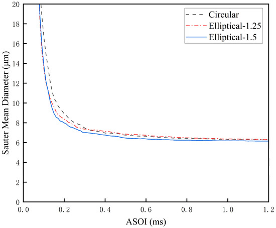 (4) In comparison to the circular nozzle, elliptical nozzles demonstrated a more rapid reduction in SMD, suggesting a more expeditious fragmentation of the spray. When the SMD tended to stabilize, the SMD of the circular nozzle and the elliptical nozzle with an aspect ratio of 1.25 both reached about 6.3 μm, and that of the elliptical nozzle with a 1.5 aspect ratio reached 6.1 μm. The reason for this was the asymmetric geometry of elliptical nozzles, which resulted in the spray being subjected to uneven shear force, which made the spray more susceptible to instability and turbulence, causing the droplets to break up faster.