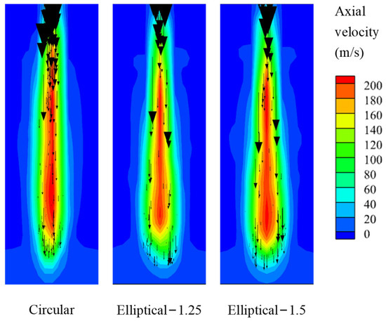 Axial velocity distribution in the XZ plane for circular and elliptical nozzles.
