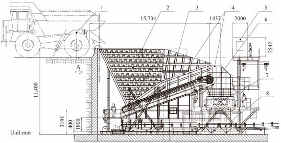 Structure diagram of the open-pit coal mine crushing station (1—Mining Truck, 2—Ore Receiving Hopper, 3—Plate Feeder, 4—Protective Steel Structure, 5—Electrical Control Room, 6—Detection Probes Array, 7—Dual-roll Screening Crusher, and 8—Belt Conveyor).