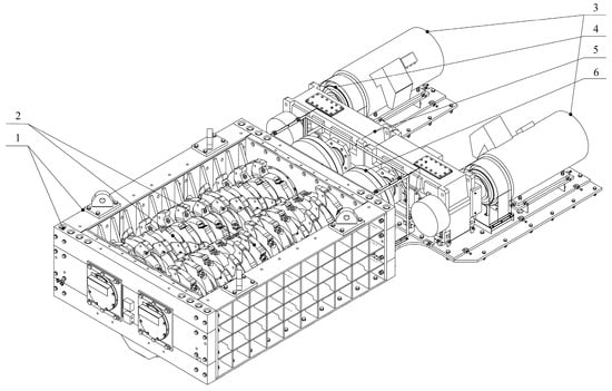 Structure diagram of the dual-roll screening crusher (1—Wear Plates for Front and Side Walls, 2—Crusher Tooth Rolls, 3—Drive Motor, 4—Hydraulic Coupling, 5—Reducer, and 6—Coupling).