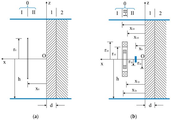 First, a cylindrical coordinate system or x is established, dividing the field into four regions: I, II, 1, and 2. These regions represent the area where the single-turn coil is far from the detection target along the x-axis, the area where the single-turn coil is close to the detection target along the x-axis, the metallic foreign object region, and the feeding coal layer region, respectively. Regions I and II can be combined into region 0. As shown in the diagram, the radius of the single-turn coil is r0, the distance between the coil and the metallic foreign object layer is x0, the radius of the truncated region is h, and the thickness of the metallic foreign object layer is d.