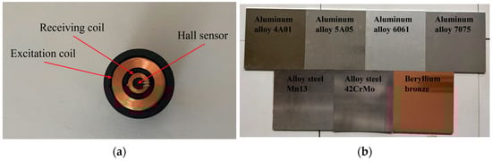 The sample dimensions are determined based on the maximum discharge particle size of the SANDVIK dual-roll screening crusher CR610/14-35, which is 300 mm. The length and width are 300 mm × 300 mm, with thicknesses chosen as 3 mm, 5 mm, 7 mm, 10 mm, and 12 mm. The materials of the samples are selected from common metal foreign objects found in coal mine crushers, such as alloy steel Mn13, 42CrMo, copper alloy beryllium bronze, aluminum alloys 4A01, 5A05, 6061, and 7075, as shown in Figure 7b. The relative magnetic permeability of the ferromagnetic alloy steel 42CrMo is taken as 60, while the relative magnetic permeability of other metals is 1. The electrical conductivity of the samples is measured using the Autosigma3000 from General Electric Company (Boston, MA, USA), and the conductivity parameters are shown in Table 2.