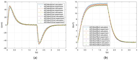 Figure 8 above shows the output signal curves of the ferromagnetic alloy steel 42CrMo at five different thicknesses, with the probe lift height set to 5 mm. Figure 9 extracts the relationship between the key characteristic quantities and the thicknesses from Figure 8. The results indicate that as the sample thickness increases, the peak value gradually decreases, while the peak time gradually increases. The differential output signals Uref(t) and Bref(t) from the receiving coil and Hall sensor exhibit the same characteristics. The two results corroborate each other, allowing for more accurate classification and identification of ferromagnetic metals. The simulation used a CPU E-2276M (Intel Corporation, Santa Clara, CA, USA) and MATLAB 2023b, and the simulated data closely matched the measured results.