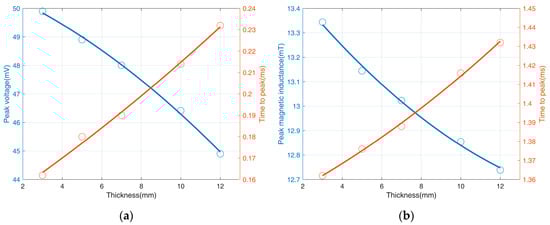 Relationship between key characteristic quantities of PEC differential signals and the thicknesses of alloy steel 42CrMo; (a) peak voltage and its corresponding time to peak; (b) peak magnetic inductance and its corresponding time to peak.