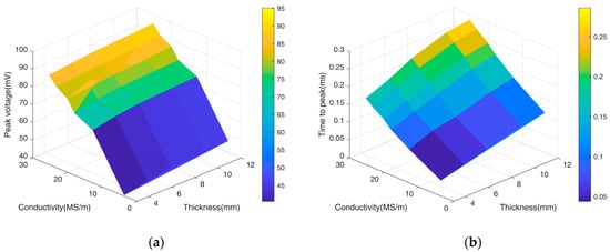 Three-dimensional surface plots between key characteristics of pulsed eddy current differential voltage signals and the conductivity and thickness of non-ferromagnetic metals; (a) peak voltage; (b) time to peak.
