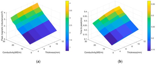Three-dimensional surface plots between key characteristics of pulsed eddy current differential magnetic inductance signals and the conductivity and thickness of non-ferromagnetic metals; (a) peak magnetic inductance; (b) time to peak.