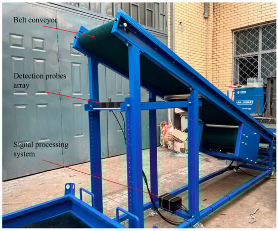 Figure 12 shows the experimental platform set up to simulate the coal mine site. The belt width of the belt conveyor is 400 mm, and the belt running speed is the same as that at the coal mine site, which is 0.3 m/s. Four multi-probe arrays are set one meter below the exit of the belt conveyor. These four multi-probe arrays are evenly spaced, with a detection range of 300 mm. Data are collected at a horizontal distance of 5 mm from the falling metallic foreign object. The position and horizontal width of the metallic foreign object are determined based on the range of signals received by the multi-probe array. The vertical width of the metallic foreign object is then calculated by the time range of the effective detection signals from the multi-probe array.