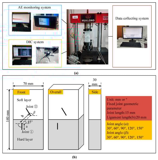 The strength and deformation parameters of jointed rock masses are dominated by the configuration of joints, encompassing factors like joint density [3,4], joint length [5,6], joint angle [7], and the relative positioning of joints [8,9]. Bobet et al. [10] analyzed the failure characteristics of rocks containing parallel double joints, categorizing them into tensile and shear cracks. Wong et al. [11] utilized a high-speed camera to monitor the loading process, examining the effects of parallel joint inclination, joint length, bridge angle, and bridge length on crack coalescence patterns. Pan [12], Aliabadian [13,14], Sharafisafa [15,16], and Lin [17] employed digital image correlation (DIC) methods to document crack propagation patterns in jointed rock analogues and rocks. However, as unparallel joints are prevalent in nature, the interaction between parallel joints cannot describe the authentic failure characteristics of rocks. As a result, research endeavors have focused on the behavior of unparallel joints. Yang et al. [18] conducted uniaxial compression tests on non-coplanar joint sandstone, finding that peak strength is influenced by joint angle, whereas elastic modulus remains unaffected. Feng et al. [19] performed dynamic loading tests on rocks with non-coplanar fractures, suggesting that a larger joint inclination leads to a higher elastic modulus. Yang et al. [20], in their investigation of unparallel jointed rocks, identified 90° as a critical angle influencing peak strength, elastic modulus, and peak strain. Compared to rocks with parallel joints, the evolution of principal strain in the bridge zone of unparallel joints is more complex, influencing crack coalescence patterns. Notably, the aforementioned studies on unparallel jointed rocks focused solely on single-lithology rocks, necessitating research into the mechanical properties and failure modes of jointed composite rock layers.