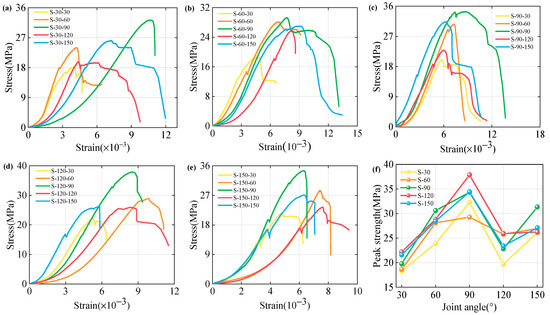 Mechanical properties of defective specimens: (a) S-30 group, (b) S-60 group, (c) S-90 group, (d) S-120 group, and (e) S-150 group; and (f) peak strength under various upper joint angles.