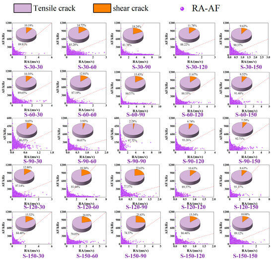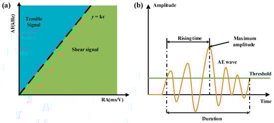 Furthermore, since the AE signals generated by micro-fractures are recorded in the form of waves, the types of micro-fractures can be identified through the AE parameters RA and AF [32]. RA and AF can be calculated by utilizing the following equations [33]: