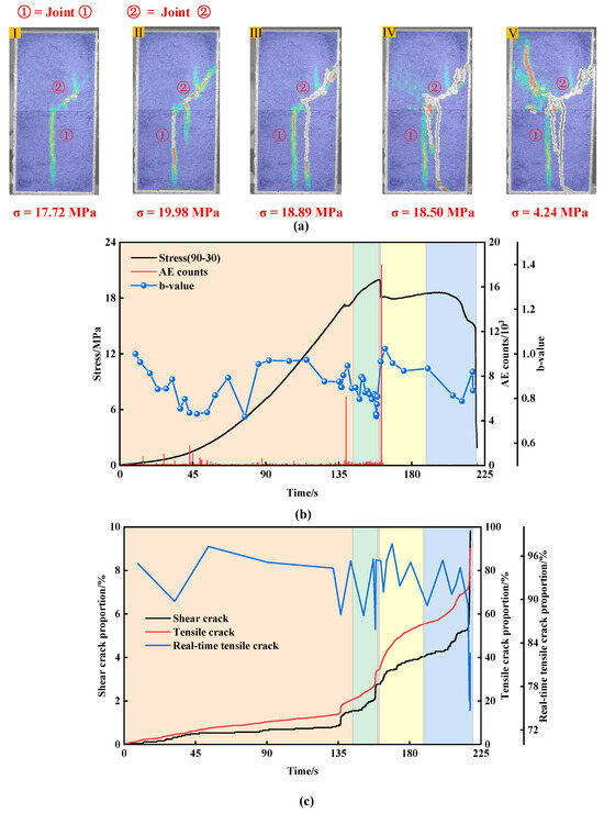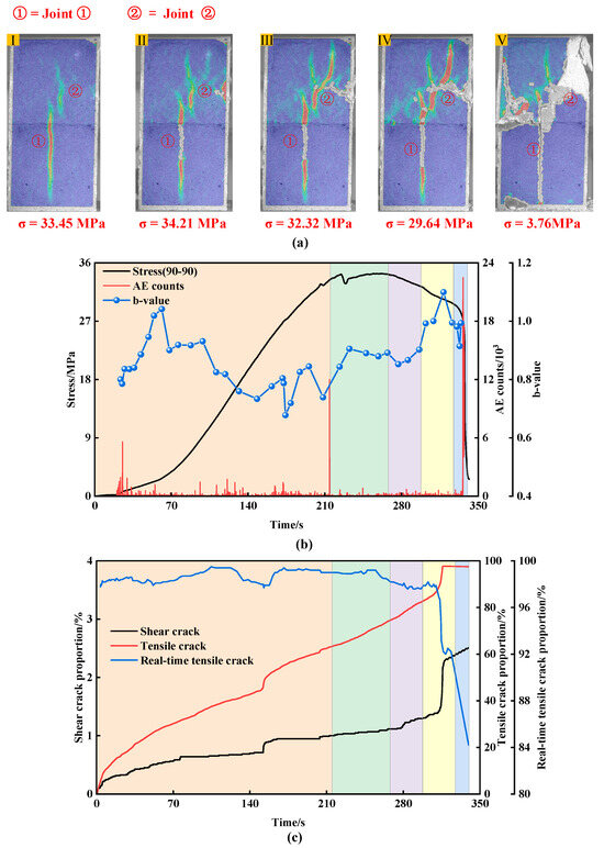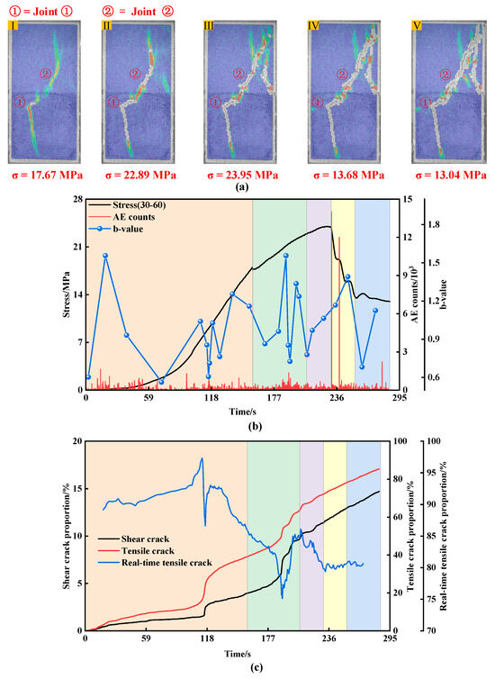 With the stress decreasing to 3.76 MPa (stage V), the tensile cracks at the lower tip of joint ① extend to the bottom of the specimen, leading to rock instability; the distal tensile cracks extend to the left interface of the specimen. In Figure 6b, it becomes evident that AE counts attain a peak, accompanied by an intensified acceleration in the rise and fall of b-value, which is indicative of an accelerated failure process within the specimen. Meanwhile (Figure 6c), the real-time tensile crack ratio drops to around 85%, indicating the enhanced influence of shear slip during stage V.