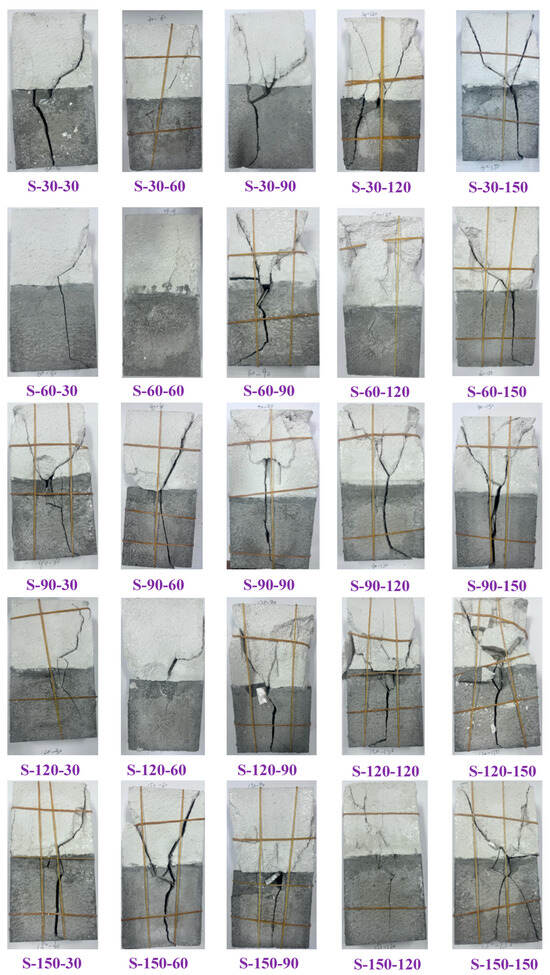 Because of the extremely rapid crack propagation during the failure stage, numerous cracks initiate nearly simultaneously, posing significant challenges in capturing the entire failure process, even with the assistance of high-speed cameras. Therefore, researchers have qualitatively analyzed the crack evolution behavior of post-failure specimens. In Figure 7, the crack evolution diagrams during the failure of specimens containing unparallel defects are recorded. Upon observing Figure 7, it is evident that when the angle of joint ② is 90°, varying the angle of joint ① results in the failure of the specimen being predominantly governed by joint ①. This is due to the fact that the crack initiates first at the tip of the vertical joint. As the coplanar strain band at the upper tip of the joint penetrates the bedding plane, the coplanar tensile strain band at the lower tip accelerates its propagation, leading to the dominant failure of the specimen. When joint ① is vertical, consider specimen S-90-90 as an example. The tensile crack starts at the outer tip of joint ① and moves towards the bottom of the specimen. Meanwhile, the crack at the inner tip extends towards and penetrates the bedding plane, forming another tensile crack. Joint ② does not exhibit crack propagation. Specimens S-30-90, S-60-90, S-120-90, and S-150-90 all experience instability and failure due to the propagation of tensile cracks initiated at the tip of joint ①.