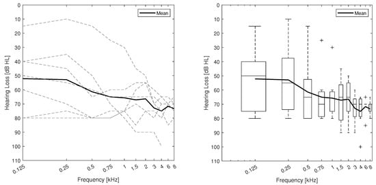 (left) Audiograms of all 7 bimodal participants for the HA side (dashed lines), as well as the mean (continuous line). (right) Audiograms for all 7 bimodal participants presented as boxplots, displaying the 25th and 75th quartiles, the median values, outliers (indicated by +), and the mean (represented by a continuous line).