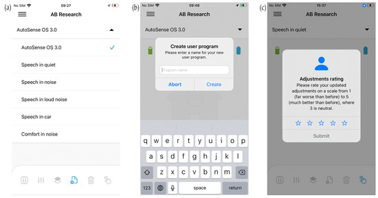 (a) App environment for program selection: (b) naming a new program; (c) evaluation process of a saved adjustment.