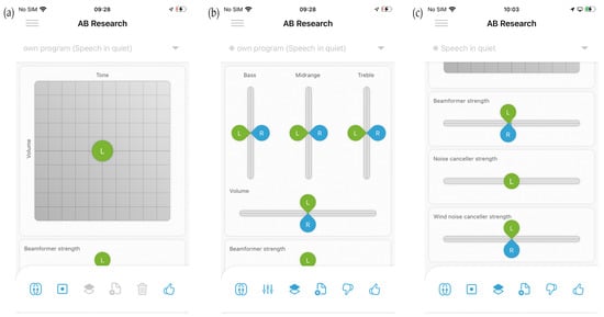 The application’s self-adjustment function to change the daily listening experience is based on methods for modifying frequency-dependent gain parameters as described by Kliesch et al. [9]. For this study, both the EQ user interface (EQ UI) and the 2D user interface (2D-Surface UI) were integrated into the self-adjustment workflow. These UIs empowered users to make frequency-specific adjustments, including modifications to bass, midrange, treble, and overall volume. All changes were applied to an initial expert setting, which was created during the first study appointment (see Section 2.5). Furthermore, in this study, users had the ability to adjust beamforming strength, noise reduction, and wind noise reduction based on the AutoSens OS 3.0 program parameters at the moment the participant initiated the program creation for the first time. One of the two user interfaces (UIs) provided in this study was a classic equalizer and volume control interface (EQ UI), while the other followed a tactile 2D-Surface concept (2D-Surface UI) for manipulating frequency-specific sound parameters. The EQ UI, shown in Figure 3a, allowed participants to adjust three frequency ranges: low (centered at 172 Hz), medium (centered at 861 Hz), and high (centered at 4.5 kHz), along with overall volume. Adjustments could be made for both the HA and CI simultaneously or independently, if the two pointers for each slider were decoupled. Each slider offersreda range of ±10 dB, and in combination with the volume control, total gain adjustments of ±20 dB were possible. The 2D-Surface UI, depicted in Figure 3b is based on concepts developed by Dreschler et al. [13], Gößwein et al. [7], Rennies et al. [14] and further refined in the work of Kliesch et al. [9]. In this interface, participants adjust sound parameters by moving a point within a square. As with the EQ UI, adjustments can be made simultaneously or independently for both the HA and CI if the points for the left and right sides are decoupled. Moving the point along the x-axis selects different gain–frequency curves focused on specific frequency ranges, while moving it along the y-axis allows for boosting or cutting these frequencies. Unlike the EQ UI, which utilizes three band-pass filters, the 2D-Surface UI combines a high-pass and a low-pass filter, with a gain range of ±20 dB. In addition to the frequency adjustments, three additional sliders were incorporated, as shown in Figure 3c. These sliders allowed participants to adjust beamforming, noise reduction (HA only), and wind noise reduction. This expanded functionality enabled participants not only to amplify or attenuate specific frequency ranges but also to control the intensity of individual signal processing steps.