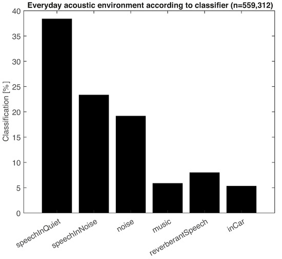 The evaluation of the data on the acoustic environments from all study participants is shown in Figure 4. The analysis revealed that the “speech in quiet” scenario accounted for 39% of participants’ daily situations. Similarly, acoustic environments such as “speech in noise” (24%) or “noise” (18%) occurred with comparable frequency. Conversely, situations such as “music”, “reverberant speech”, and “in car” collectively represented only about 19% of all observed everyday scenarios. However, an analysis of individual participant datasets, as shown in Figure 5, highlighted the highly personalized nature of everyday life situations. For example, a significant disparity was evident between participants MHH01 and MHH04: while MHH01 frequently chose or found themselves in quiet situations with speech, MHH04 more often selected or experienced environments with both speech and background noise.