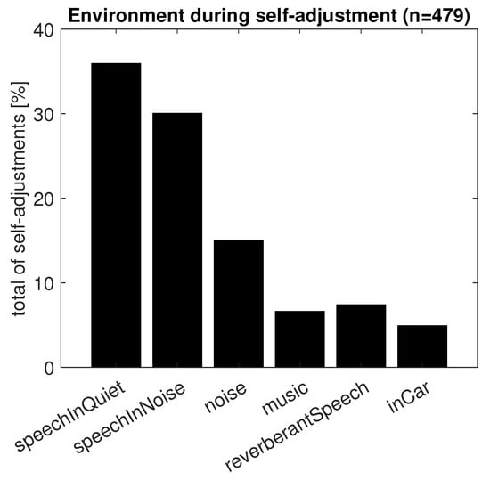 To investigate the potentially increased need for personalized adjustments in certain everyday situations, the prevailing acoustic environments at the time of self-adjustment were analyzed and are presented in Figure 6. It was found that 38% of all self-adjustments occurred in quiet situations with speech and approximately 29% in situations with speech with background noise. These two conditions accounted for nearly two-thirds of all observed everyday situations where self-adjustments were performed. However, the pattern in this distribution mirrored the general distribution of acoustic situations in daily life, as shown in Figure 4. To account for the inherent bias introduced by this natural distribution, an adjustment was made by factoring out the general distribution of acoustic scenarios. Specifically, inverse factors based on the data in Figure 4 were applied to the self-adjustment data in Figure 6. The adjusted data, shown in Figure 7, revealed a more homogeneous distribution. A detailed analysis using a two-sided binomial test showed that self-adjustments were made significantly more frequently in the “speech in noise” situation (p < 0.01) and significantly less frequently in the “noise” situation (p < 0.05).