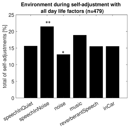The environment during self-adjustment for all participants, taking into account the frequency of acoustic situations in everyday life presented in Section 3.1.1. * Significant at a level of p < 0.05; ** significant at a level of p < 0.01.