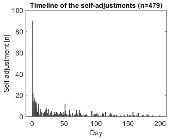 The following section examines app usage throughout the entire study period in more detail. While all participants used the app consistently during this study, a decline in usage was observed over time. App usage can be divided into two main functions: making self-adjustments and switching between programs. As shown in Figure 8, self-adjustments were predominantly made at the beginning of this study and then declined significantly over time. In contrast, the function to switch programs and access user-created programs was used consistently throughout the study period, showing only a minimal decline. In Figure 9, only program changes to a program previously created by the participant were taken into account.