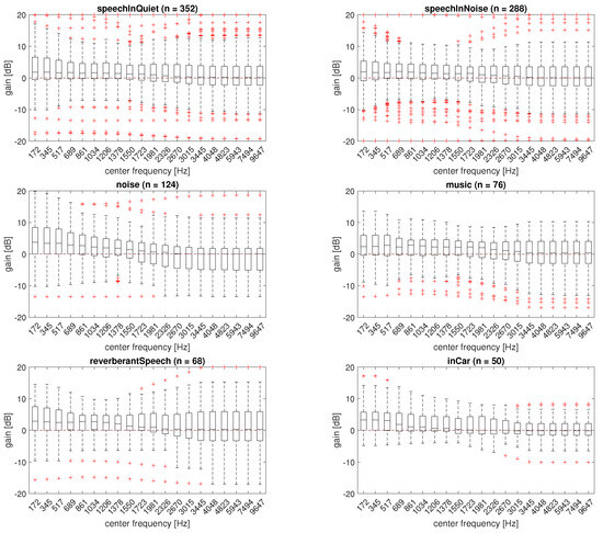 The resulting gains for each filter band depending on the prevailing acoustic environment during self-adjustment. The settings of the left and right sides of each program were taken into account. Outliers were indicated by “+”. The total number of settings n was therefore twice as high as the underlying number of programs.