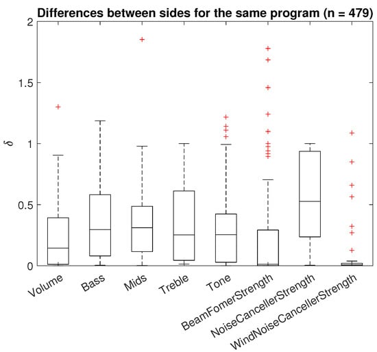 Figure 14 illustrates the variations in the settings for each individual parameter between the two ears. The calculation formula of is provided in Equation (1). The “Volume” parameter encompasses the volume settings of both the EQ and 2D-Surface UIs. The parameters “Bass”, “Mids”, and “Treble” reflect the settings adjusted within the EQ UI. The “Tone” parameter represents the slider position along the y-axis within the 2D-Surface UI, indicating the chosen frequency curve. The three remaining parameter sets “BeamFomerStrength”, “NoiseCancellerStrength”, and “WindNoiseCancellerStrength” represent the settings for the pr-processing steps in both the EQ and the 2D-Surface UIs.