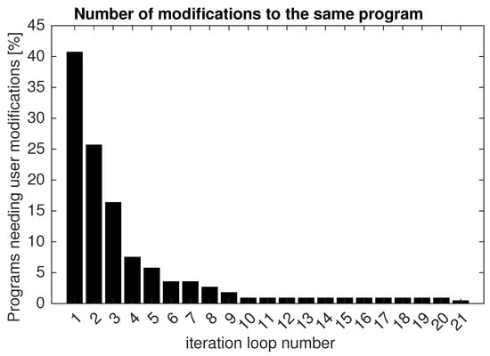 Figure 15 illustrates how frequently a program was modified by the users, indicating the number of iteration loops each program underwent. It can be observed that 43% of all created programs were modified at least once after their initial creation. This also implies that 57% of all created programs did not require further modifications. As shown in Figure 15, the likelihood of a program being modified decreased with each additional iteration loop.