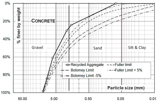 The aggregate obtained from the crusher is described by means of a granulometric curve [30,31,32] compared to the standard Bolomey and Fuller curves (Figure 2, Figure 3, Figure 4, Figure 5, Figure 6, Figure 7 and Figure 8), where the dashed lines represent the Fuller (upper) and Bolomey (lower) curves increased/reduced by 5%.