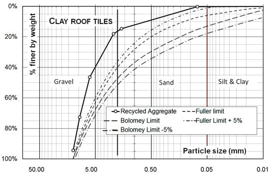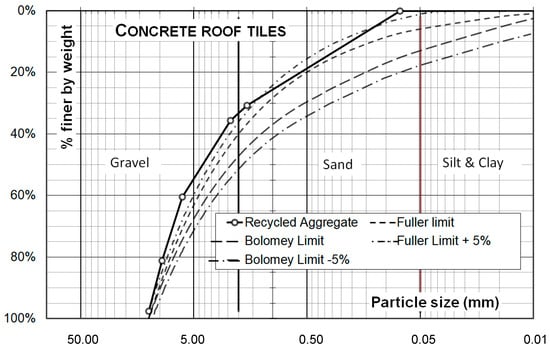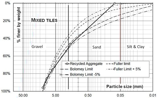 For a more complete characterization of the recycled aggregate, Table 2 summarizes density and water absorption. The values of Table 2 may change according to the waste material used, the quality of the materials to be recycled, and the specific crusher that is used. It is worth noting that the density of recycled aggregates is significantly lower than the density of natural aggregates, which is between 1400 and 1600 kg/m3 for natural gravels. In addition, water absorption (as % in weight over the dry weight) is quite high, mainly when the fraction of clay (bricks and roof tiles) is high. It may seem surprising that gres-porcelain tile proves such a high % of water absorption, which is due not to the “absorption” of water by the aggregates but to the water trapped on the surface of the aggregate (adsorption). All the tests were performed on oven-dried aggregates.