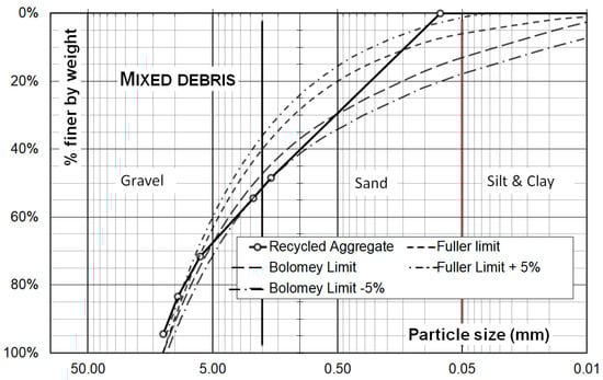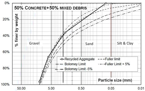 Granulometric curve for mixed 50% concrete + 50% mixed debris. Dashed curves: +5% and −5% curves.