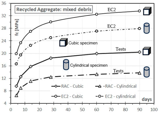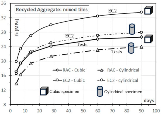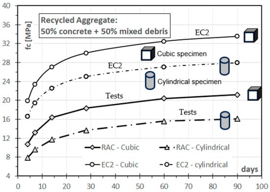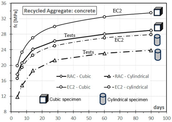 - The strength of RAC is always lower than the strength provided by EC2 for standard concrete with type I cement (Portland type)—see Table 4 for a quantitative estimate; we can see that in early aging, the cylindrical strength is always more distant from the EC2 foresight than the cubic one;