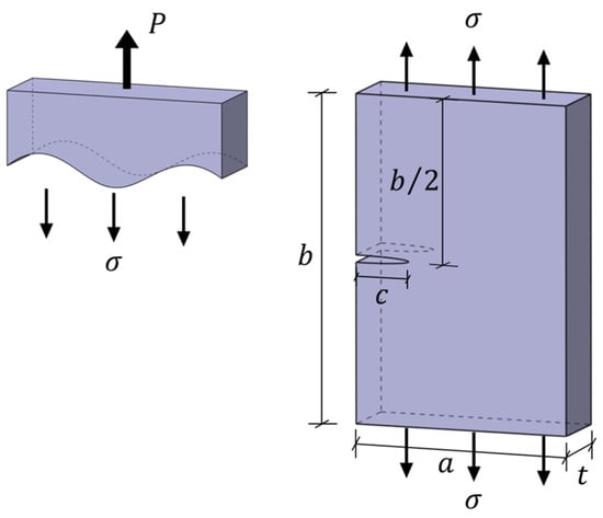 In the first stage, LEFM is employed to determine the critical loads causing brittle fracture or the initiation of crack propagation. For brittle metals, the material behaviour is dominantly elastic and the fracture response is brittle. Thus, LEFM applies. The plane strain fracture toughness is a given material property (the subscript I in represents Mode I of crack surface displacement). A given material can resist a crack without brittle fracture as long as the stress intensity factor is below the critical value . For a SENT specimen, the solution of has been formulated as a function of the applied load, the crack length, and the geometrical configuration of the specimen using LEFM and is available in the literature [25,26]. By referring to the plane strain fracture toughness of the material under investigation and utilizing the solution of inversely, the critical load applied to the SENT specimen (i.e., the cracked plate) for a specific crack length can be determined (as detailed in Appendix A). Thus, as the crack length increases, the development of the critical load can be obtained. Assuming the cracked plate is a structural component under uniform uniaxial tension, the service load of the structural component can be decided using yield strength and appropriate safety factor . Once the service load is determined, it can be compared with the development of the critical load as the crack grows. When , the corresponding crack length is the critical crack length beyond which brittle fracture may occur.