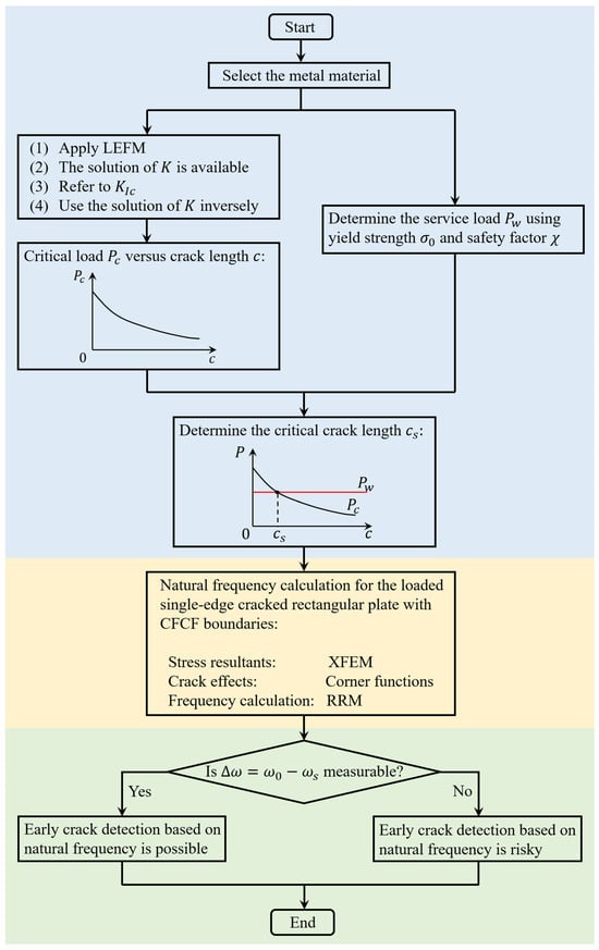The methodology of the current study is shown in Figure 2. The process includes three stages (as indicated by different colours), i.e., the application of linear elastic fracture mechanics (LEFM), natural frequency calculation for single-edge cracked rectangular plates under uniaxial in-plane load, and natural frequency measurement.
