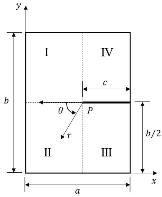 For a single-edge cracked rectangular plate as shown in Figure 3, the admissible functions of the RRM should satisfy the boundary conditions of the cracked plate. Meanwhile, the stress singularities at the crack tip and the discontinuity of displacement and slope across the crack surfaces should be described.