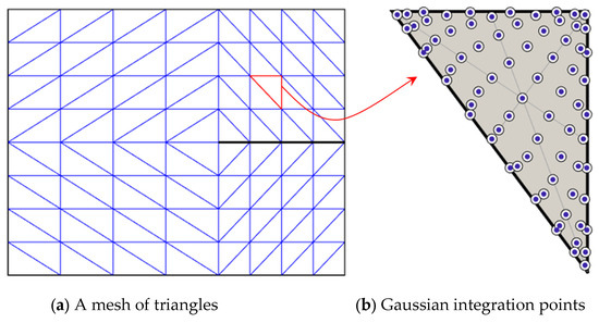 When deriving the terms in the stiffness matrix, a mesh of triangles is used to perform Gaussian integration (as shown in Figure 4a). The mesh can be refined iteratively by connecting the midpoints of the edges of each triangle. The Gaussian quadrature rule of degree 19 is applied to the triangles, which leads to 73 integration points within each triangle (as shown in Figure 4b).