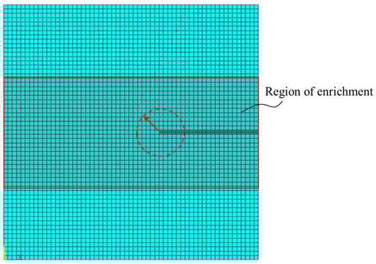 To ensure the accuracy of frequency results, the in-plane stress resultants , and are calculated using the XFEM. The XFEM allows the finite element mesh to be completely independent of the morphology of the crack [38]. It reduces the significant mesh refinement near the crack tip, thus rendering efficient computation. The computation is facilitated by compiling an APDL routine in FEA software ANSYS 18.0. The finite element model discretization is shown in Figure 5. The shadowed area shows the region of enrichment, where the enriched displacement approximation [39] is written as follows: