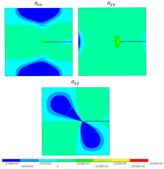 The stress distribution obtained using 119 119 elements is shown in Figure 6. The stress concentration near the crack tip can be observed. As expected, the normal stresses are symmetric about the centreline, while the shear stress is antisymmetric. Overall, the stress distribution of a cracked plate is significantly different from that of an intact plate, where and . Therefore, for a loaded cracked plate, it is necessary to determine the stress distribution before commencing natural frequency calculation.