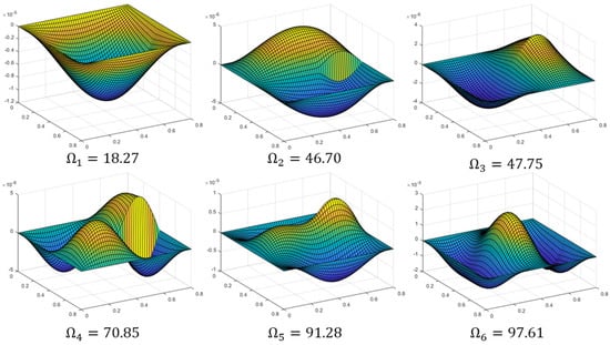 Substituting Equation (4) into Equations (1)–(3) and minimizing the functional Π with regard to undetermined coefficients , and yields linear algebraic equations. The solution to the eigenproblem defined by these equations gives the eigenvalue of the system and their corresponding eigenvectors. Natural frequencies are the square root of the eigenvalues, while the eigenvectors define the vibration mode shape.