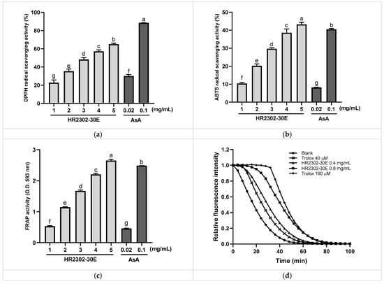 Antioxidant activity of HR2302-30E. (a) 2,2-Diphenyl-1-picrylhydrazyl (DPPH) scavenging activity. (b) 2,2′-Azino-bis(3-ethylbenzthiazoline-6-sulfonic acid) (ABTS) radical scavenging activity. (c) Ferric reducing antioxidant power (FRAP). (d) Oxygen radical absorbance capacity (ORAC) plot. ORAC values are expressed as the net area under the curve. Data are represented as the mean ± standard error of the mean (SEM) of three independent experiments. Different letters on the bars indicate significant differences (p < 0.05) in the Duncan multiple range test. a~g, significant differences among various samples. AsA, Ascorbic acid.