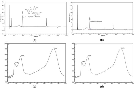 High-performance liquid chromatography (HPLC) chromatograms and photodiode array (PDA) spectra of cyanidin-3-glucoside (C3G) (a,c) and HR2302-30E (b,d).