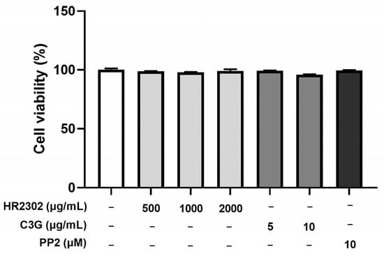 An MTT assay was performed to evaluate the effect of HR2302-30E on the viability of RBL-2H3 cells. As shown in Figure 3, the viability of RBL-2H3 mast cells treated with various concentrations of HR2302-30E and C3G was evaluated using the 3-(4,5-dimethylthiazol-2-yl)-2,5-diphenyltetrazolium bromide (MTT) assay. Notably, both HR2302-30E (500, 1000, and 2000 μg/mL) and C3G (5 and 10 μg/mL) did not significantly affect the cell viability compared to the negative control; thus, the extract is not cytotoxic to the selected cell line.