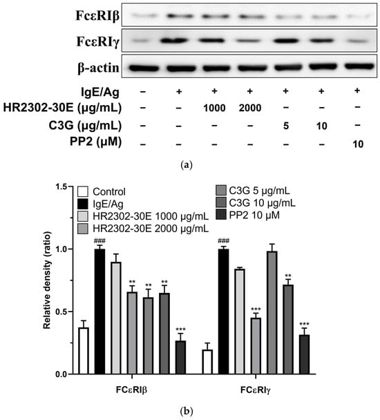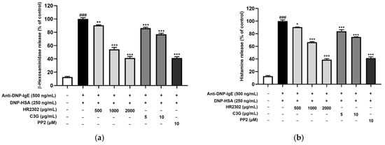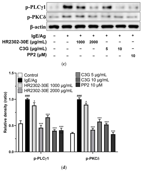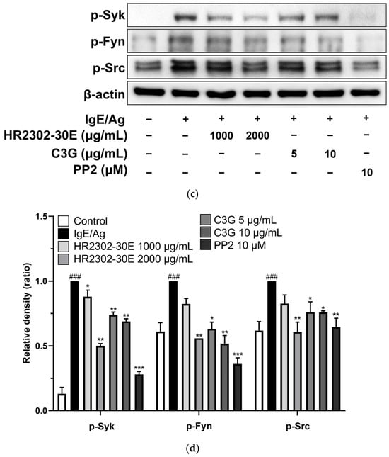 To evaluate the effect of HR2302-30E and C3G on the degranulation of RBL-2H3 cells, the release of β-hexosaminidase and histamine was measured. In activated mast cells, pre-formed β-hexosaminidase and histamine are released into the granules during degranulation [59]. β-hexosaminidase and histamine levels are widely used as markers of mast cell degranulation, which plays an important role in allergic responses [60,61]. To evaluate the inhibitory effect on degranulation, an early marker of allergic response, IgE-primed RBL-2H3 cells were stimulated with 250 ng/mL DNP-HSA and treated with HR2302-30E (1000 and 2000 μg/mL) and C3G (5 and 10 μg/mL). The release of β-hexosaminidase and histamine was measured to assess the degranulation of RBL-2H3 mast cells. As shown in Figure 4, HR2302-30E and C3G significantly decreased β-hexosaminidase (Figure 4a) and histamine release (Figure 4b) in activated mast cells. PP2, an Src family kinase inhibitor, was used as a positive control. These results suggest that HR2302-30E and C3G inhibit the activation-induced degranulation of mast cells.