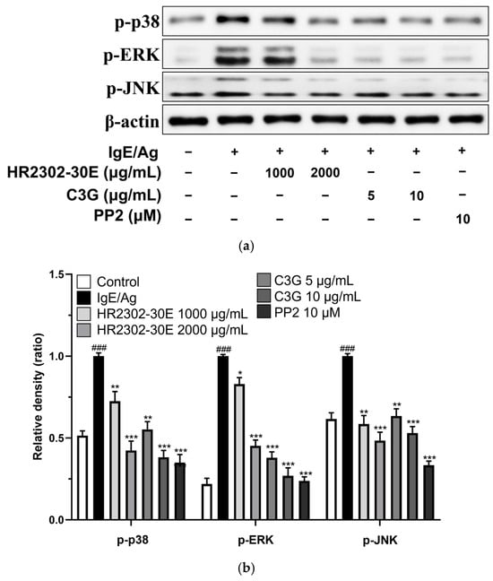 Effects of HR2302-30E and C3G on (a) β-hexosaminidase and (b) histamine release in RBL-2H3 mast cells. IgE-primed RBL-2H3 cells were incubated with 250 ng/mL of DNP-HSA and HR2302-30E (500, 1000, and 2000 μg/mL) and C3G (5 and 10 μg/mL). Negative control: non-IgE-primed RBL-2H3 cells without DNP-HSA; positive control: IgE-primed RBL-2H3 cells with DNP-HSA and PP2. Data are represented as the mean ± SEM of the three independent experiments. The statistical analyses were performed using the Dunnett t-test. PP2 is a general Src family kinase inhibitor. * p < 0.05, ** p < 0.01 and *** p < 0.001 vs. anti-DNP IgE plus DNP-HSA (IgE/Ag); ### p < 0.001 vs. control. −, No treatment, +, Treatment.