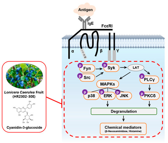 Allergy is the overreaction of the immune system to a generally harmless substance, accompanied by an inflammatory response. Mast cell activation is the response to the cross-linking of allergens to the IgE/FcεRI complex, which induces allergic immune responses. FcεRI receptor consists of an α-subunit to which IgE binds and β- and γ-subunits involved in intracellular signaling. Upon receptor aggregation, initial phosphorylation of ITAM in the β- and γ-subunits is caused by Lyn and Fyn, respectively, which are Src family kinases. Activated ITAM serves as a docking site for the activation of Syk [81,82,83]. Incubation of RBL-2H3 cells with IgE in vitro increases the expression of FcεRI on the cell surface [84,85]. Moreover, FcεRI aggregate formation is activated by Src family kinases, such as Lyn, Fyn, and Syk [82]. HR2302-30E and C3G significantly decreased the expression of FcεRIβ and FcεRIγ and inhibited the phosphorylation of Src, Fyn, and Syk in anti-DNP-IgE-activated RBL-2H3 mast cells. These results indicate that HR2302-30E and C3G inhibit mast cell activation by blocking the binding sites of FcεRI and interfering with the signaling pathways of Src, Fyn, and Syk.