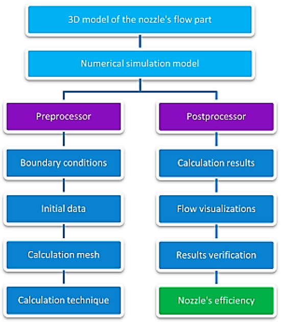 The numerical calculations were made using software complexes ANSYS and FlowVision to get the operating parameters of the air-abrasive mixture both inside and off the nozzle. The following nozzles were tested: a Venturi nozzle with a critical diameter of 4 mm and a length of 143 mm, a Venturi nozzle with a critical diameter of 8 mm and a length of 194 mm, a cylindrical nozzle from ceramics with a length of 22 mm, a cylindrical nozzle from steel C40 with a length of 22 mm, a cylindrical nozzle from steel C40 with a length of 11 mm, a cylindrical nozzle from steel C40 with a length of 44 mm, UDC32-450 with a critical diameter of 6 mm with hydraulic smooth walls and a rough inner surface, cylindrical nozzle with an inner diameter of 20 mm, length of 22 mm. The flowchart of the numerical simulations is presented in Figure 2.