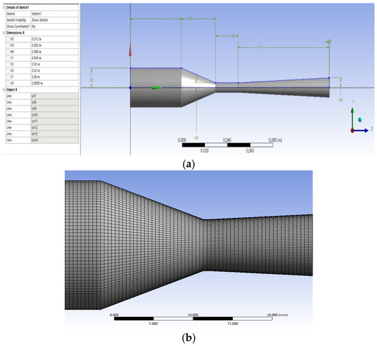 Numerical modeling with the ANSYS application algorithm is presented in Figure 3. The first stage included building a 3D model of the nozzle UDC32-45 (Figure 3a). Next, the computational grid was constructed (Figure 3b). Afterwards, a calculation model was selected, and boundary conditions were set.