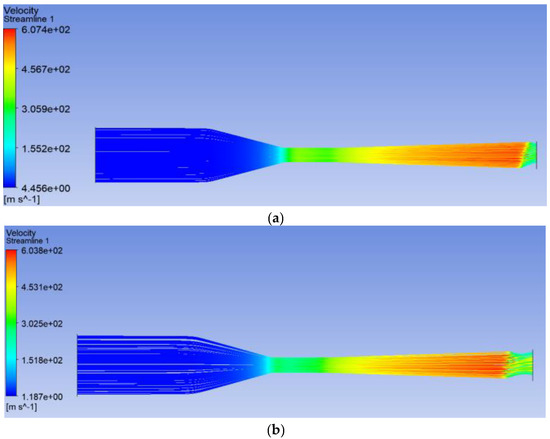 The obtained results showed that the roughness of the nozzle wall impacts the value of the working medium velocity; namely, the ceramic nozzle velocity is 15% higher at the output cross-section if compared with the metal surface with higher roughness. The consumption coefficients stay almost the same, correlating with the papers [17,18,19]. It was found that the Venturi nozzle is more sensitive to surface roughness since the differences in the values of its output velocity in the ideal and actual processes make up to 4 times.