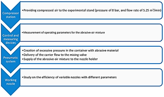 Verification of the obtained results was performed by means of a series of experimental studies with a special experimental stand designed for studies of the working nozzles of the pneumo-abrasive unit (Figure 6).