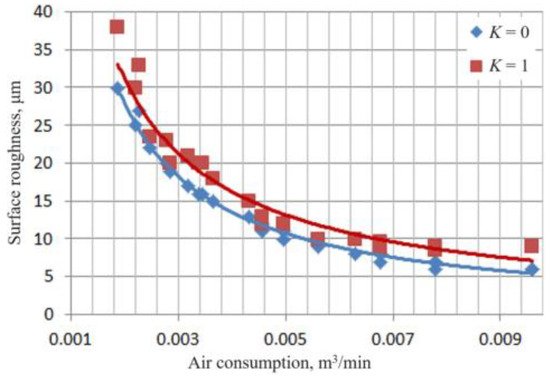 The impact of air consumption on the output surface roughness (K—roughness coefficient): points—calculated values; lines—approximation lines.