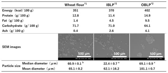 General composition, SEM images and particle size of wheat flour and waxy barley bran. *1—Values for energy, protein, fat and carbohydrate were taken from those indicated on the product. Values analyzed by Bureau Veritas FEAC were used for ash content. *2—IBLP and OBLP values are taken from the report of Furuichi et al. [9]. IBLP—inner bran layer powder; OBLP—outer bran layer powder. Energy, protein, fat, carbohydrate, and ash values are shown as average values only. The values of particle size are presented as means and standard errors (n = 3). Different letters (a–c) indicate significant differences (p < 0.05).