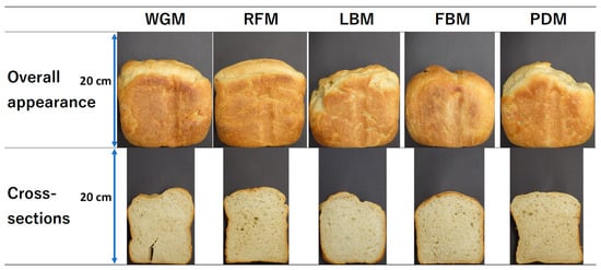 Images of the overall appearance and cross-sections of bread baked in different heating modes. WGM—whole grain mode; RFM—rice flour mode; LBM—loaf of bread mode; FBM—French bread mode; PDM—pan domi mode. A dough containing 30% inner layer bran was used.